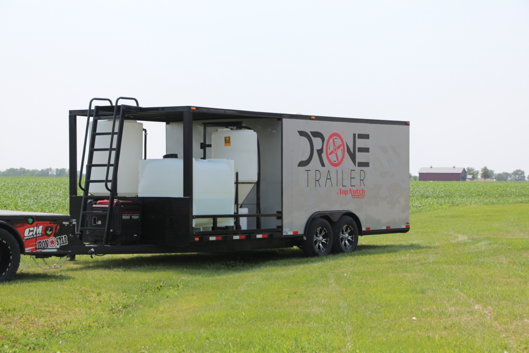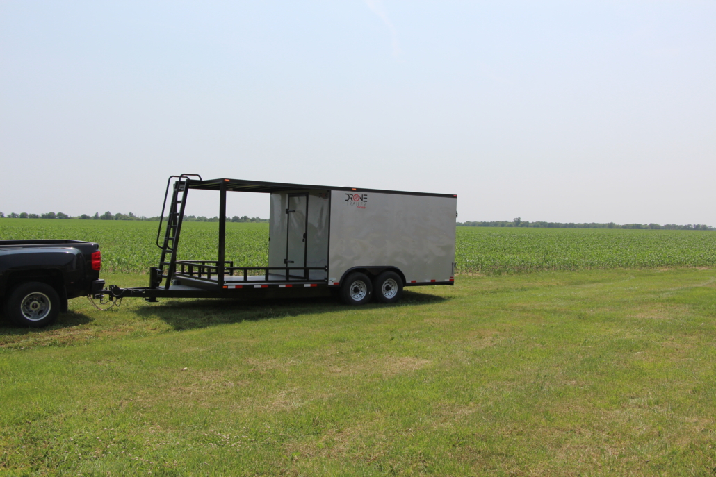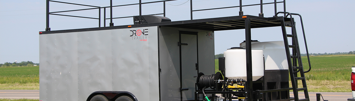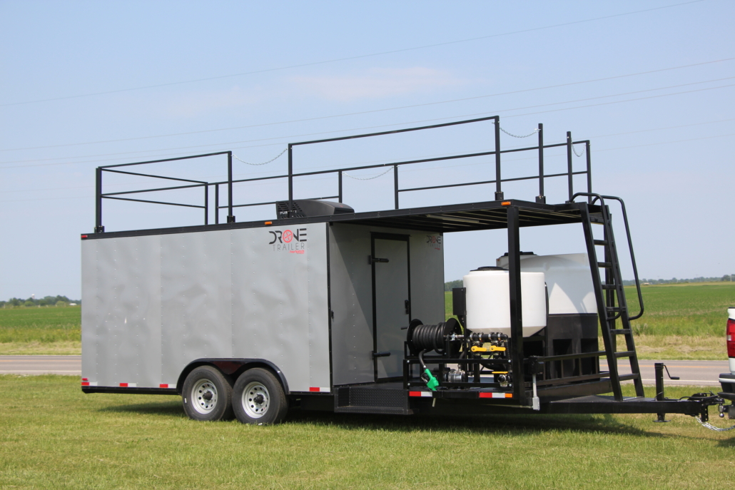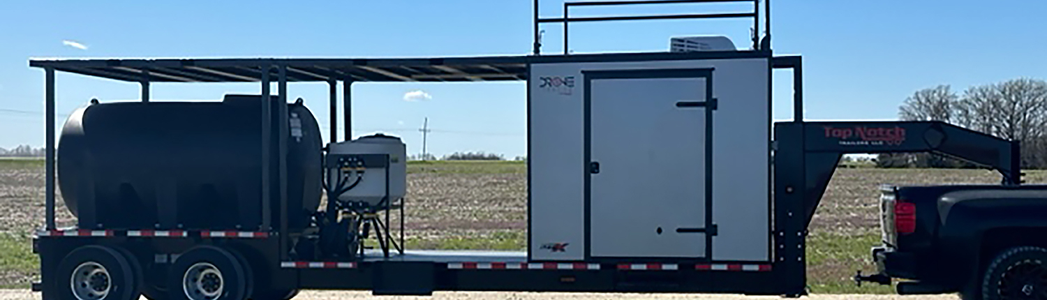The original Drone Trailer – DT1, was built to boost efficiency while giving the operator maximum enclosed storage space and also offering ventilation for liquid storage. This design increases proficiency while offering protection and comfort to the applicator. The open station was designed for liquid storage while maximizing ventilation, with an observation deck above. The enclosed portion of the trailer provides a work station with an air conditioner option that will provide the applicator comfort and optimal battery charging.