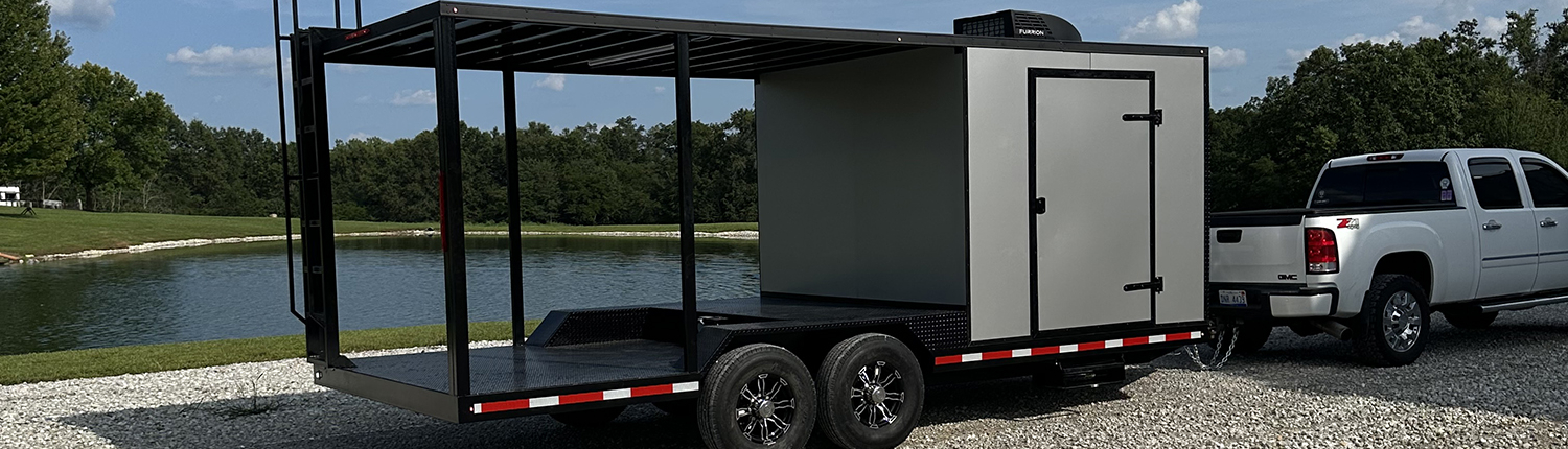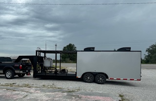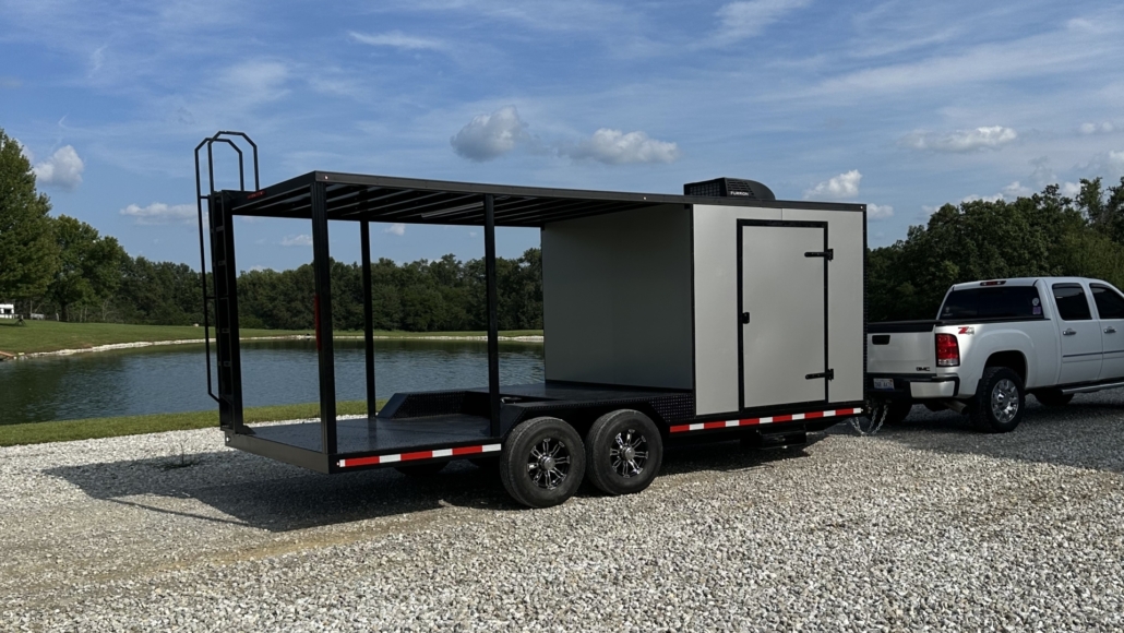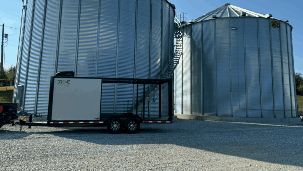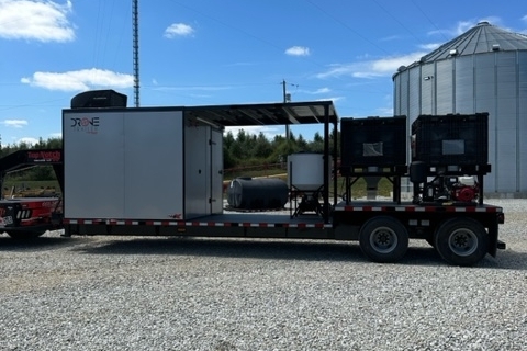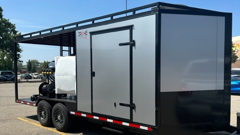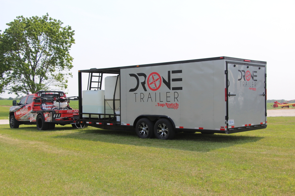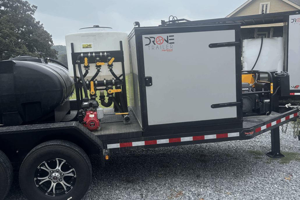 The original Drone Trailer – DT1, was built to boost efficiency while giving the operator maximum enclosed storage space and also offering ventilation for liquid storage. This design increases proficiency while offering protection and comfort to the applicator. The open station was designed for liquid storage while maximizing ventilation, with an observation deck above. The enclosed portion of the trailer provides a work station with an air conditioner option that will provide the applicator comfort and optimal battery charging.