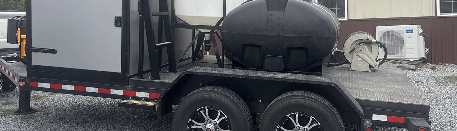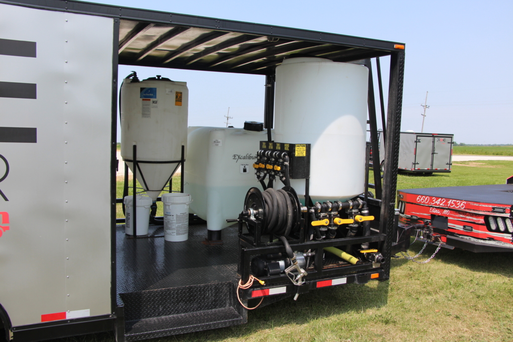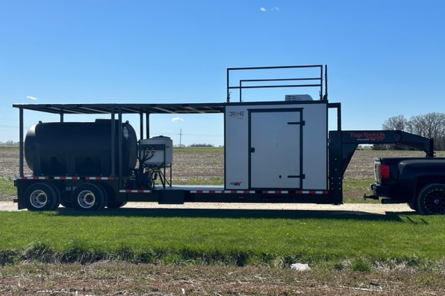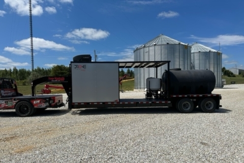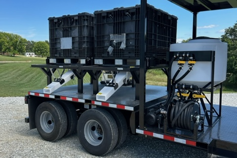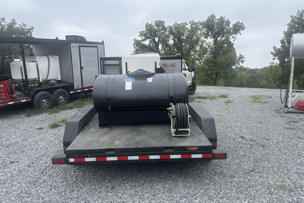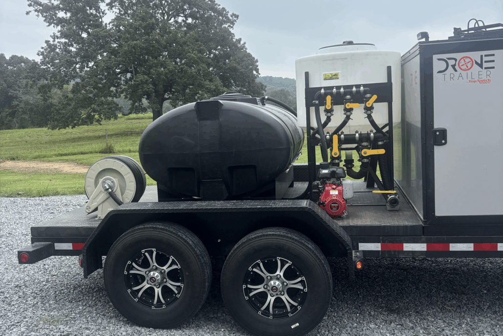 The Drone Trailer – DT2, was also designed for maximum efficiency, with features that will help applicators with different areas of operation. Moving the open station to the back allows the operators to work off of the rear of the trailer in areas that would not allow them to work off of the side. With this change of design, are allowed to place the liquid tanks directly over the axles.